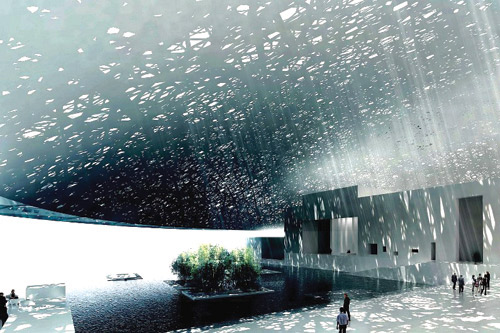 ويعد المتحف من الخارج تحفة فنية وقطعة معمارية فريدة من نوعها تم بناؤها بشكل يجعل الناظر يتوهم بأنها تطفو على سطح الماء، حيث كان لمصدر الإلهام وراء الهندسة الخيالية للمبنى، حيث العمارة العربية التقليدية الملهم الأساسي الذي اعتمده المهندس جان نوفيل- الحائز على جائزة بريتزكير- لبناء هذا المتحف على البحر؛ حيث يجمع التصميم ما بين الثقافة التقليدية المحلية وتقنيات البناء الحديث التي تجمع خمسة وخمسين مبنى منفصلاً تقع جميعها تحت القبة الرئيسة، وكل مبنى مختص بمعارض مختلفة ويمتد القطر الدائري للقبة على اتساع 180 متر ليقوم بتغطية معظم مساحة المتحف، وسيسمح النمط المعقد للقبة بتدفق الضوء، قبل أن يرتطم وينعكس بين طبقاتها الثمانية ليصل أخيرًا إلى المعارض، حيث يُسمى المهندسون هذه الطريقة بـ «الضوء المطري».