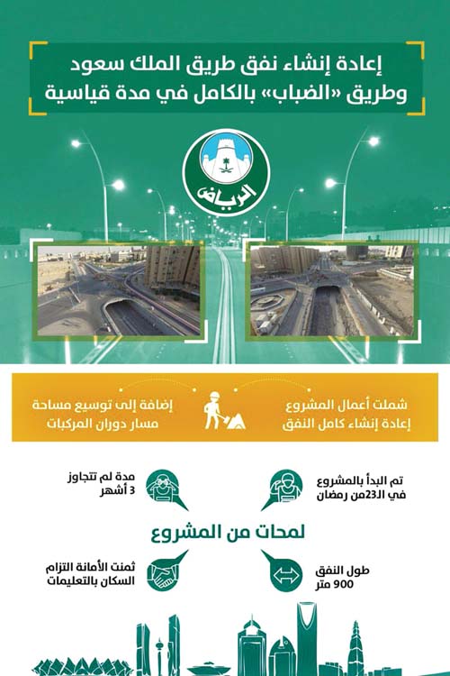 وكانت أمانة منطقة الرياض قد حرصت على البدء في أعمال إعادة إنشاء نفق طريق الملك سعود المتقاطع مع طريق الأمير عبدالعزيز بن مساعد بن جلوي «الضباب» خلال إجازة عيد الفطر الماضي، وثمنت التزام السكان بالتعليمات واللوحات الإرشادية خلال مراحل إنجاز المشروع ما أسهم في ارتفاع مستوى انسيابية حركة السير حول منطقة العمل، وساعد على إتمام إعادة إنشاء النفق بالكامل وفق البرنامج الزمني المحدد.
