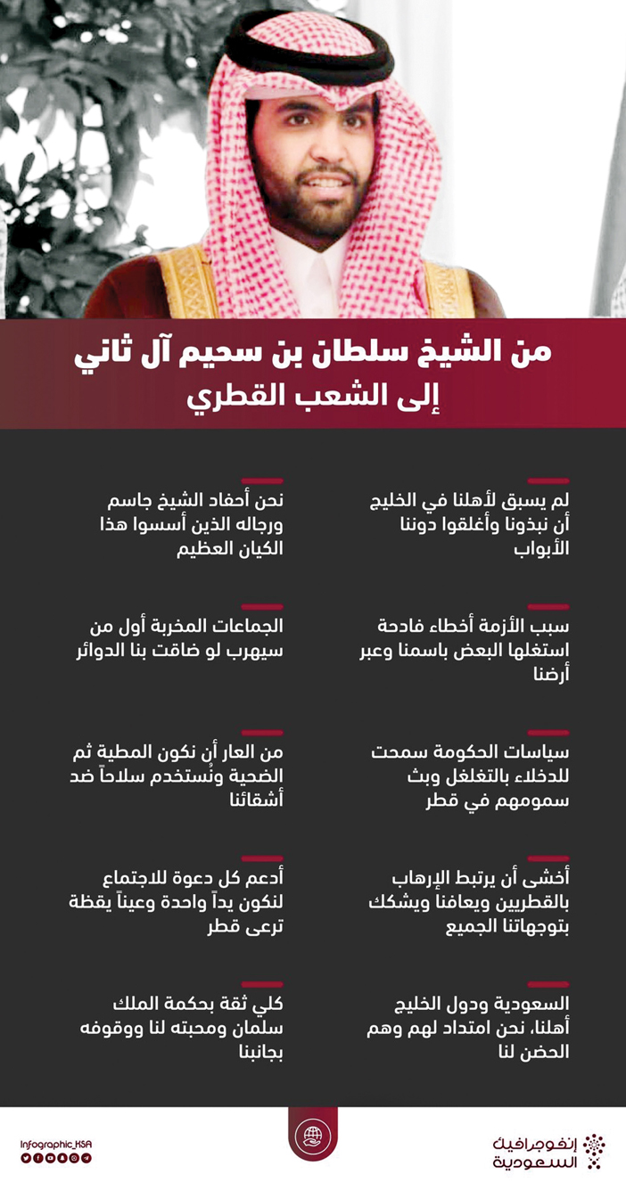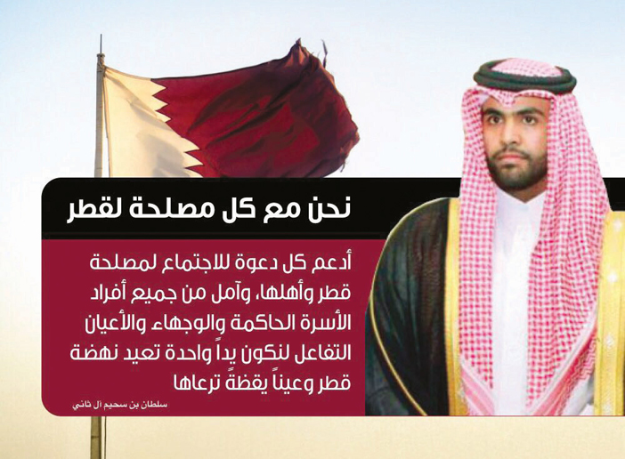 وإنني في هذا السياق أدعم كل دعوة للاجتماع، آملا من جميع أفراد الأسرة الحاكمة والوجهاء والأعيان التفاعل معها حتى نكون يدا واحدة وعينا يقظة ترعى قطر من غدر الخائنين وتحصنها من كيد الحاقدين، وكلي ثقة بحكمة الملك سلمان وقادة الدول ومحبتهم المتأصلة لنا، ووقوفهم إلى جانبنا، لعل الله يجعل منا صلة سلام تعيد الأمور إلى نصابها وتصحح كل خطأ وتطرد كل الكوابيس التي أشغلت أهلنا وأحالت حياتهم خوفا مستديما وترقبا مريرا".