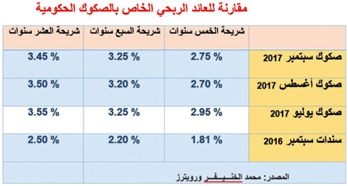فعندما نقارن العائد الربحي للصكوك مع إصدار الشهر الماضي فإن عائد شريحة الخمس والسبع سنوات زاد بمقدار 5 نقاط أساس وانخفض بمقدار 5 نقاط أساس مع عائد الصكوك العشرية. لاحظ أن العلاوة السعرية تصبح أكبر من هذا الرقم بكثير عندما نقارن عوائد هذا الإصدار مع إصدار السنة الماضية من السندات (شاهد الجدول). طبعًا شريحة الخمس سنوات هي الأكثر وفرة على خزانة الدولة مقارنة مع سندات سبتمبر 2016.