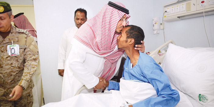 نقل صاحب السمو الملكي الأمير منصور بن مقرن بن عبدالعزيز نائب أمير منطقة عسير تحيات واعتزاز خادم الحرمين الشريفين الملك سلمان بن عبدالعزيز آل سعود، وسمو ولي عهده الأمين صاحب السمو الملكي الأمير محمد بن سلمان بن عبدالعزيز، نائب رئيس مجلس الوزراء، وزير الدفاع - حفظهما الله -، وتحيات وتقدير صاحب السمو الملكي الأمير فيصل بن خالد بن عبدالعزيز أمير منطقة عسير، للمصابين من رجال الأمن المنومين في مستشفيات القوات المسلحة.
