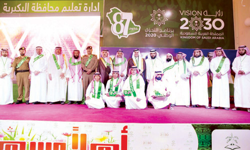 وفي ختام الحفل كرّم الخليفة الرعاة الرسميين للحفل والرعاة المشاركين بالمسيرة الوطنية وفريق العمل، وكما كرمت إدارة التعليم راعي الحفل محافظ البكيرية رئيس لجنة التنمية السياحية بدرع تذكاري بهذه المناسبة بعد ذلك أدلى محافظ البكيرية بكلمة بارك للجميع باليوم الوطني المجيد، وأشاد بالأعمال التي شاهدها خلال الحفل، وأكد للحضور أن حب الوطن قد ارتشفه الصغير قبل الكبير وحث أولياء الأمور على زرع حب الوطن في داخل أبنائهم حتى لا يكونوا عرضة للفكر المنحرف، وطلب تعاونهم وتواصلهم مع المدرسة لمتابعة الأبناء لكي يتم احتواؤهم وعدم تمكين الفكر الآخر منهم. وفي ختام كلمته شكر إدارة التعليم وعلى رأسهم مدير التعليم الدكتور خالد الراجح على نجاح حفل الاحتفاء باليوم الوطني 87 رؤية وطن.
