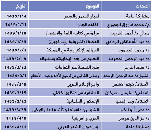 أما في جانب الندوات الثقافية الإبداعية في مجال الأدب فسيشهد النصف الأول من موسم الأحدية الثقافي ندوة عن: من عيون الشعر العربي، ما يجسد التناغم الفكري والأدبي والثقافي والإبداعي والعلمي والديني، الذي درجت عليه الأحدية في مواسمها الثقافية، التي سيكون موسمها لهذا العام على النحو المبين في (الجدول):