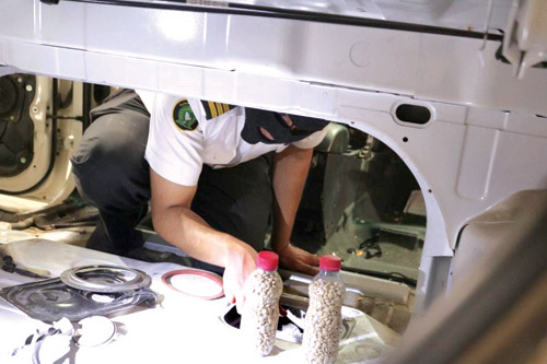 نجح جمرك الحديثة في محافظة القريات في إحباط 4 محاولات لتهريب كمية كبيرة من حبوب الكبتاجون بلغت (1.352.250) حبة، كانت مُخبأة في عدد من المركبات القادمة للجمرك. وقال إبراهيم العنزي مدير عام جمرك الحديثة: تمكّن الجمرك من إحباط تلك الكمية من حبوب الكبتاجون من خلال أربع محاولات لتهريبها، حيث قَدِمت للجمرك أولاً مركبة من نوع «خصوصي» بقيادة أحد المسافرين وعند خضوعها للإجراءات الجمركية عُثر على (745.549) حبة عُثر عليها مُخبأة بطريقة فنية في خزان الوقود الخاص بالمركبة وفي تجويف الإطار الاحتياطي، كما عُثر معه على سلاح من نوع «مسدس». وأضاف العنزي أنه تم إحباط محاولة تهريب (47.834) حبة كبتاجون مُخبأة بنفس طريقة التهريب السابقة في خزان وقود إحدى المركبات. وفي المحاولة الثالثة التي تم إحباطها عُثر على (8.000) حبة كبتاجون كانت مُخبأة في إحدى المركبات، وذلك في مخبأ تم إعداده بالقرب من محرك المركبة. وفي المحاولة الرابعة التي تم إحباطها أوضح مدير عام جمرك الحديثة أنه تم إحباط محاولة تهريب (550.867) حبة كبتاجون، عُثر عليها مُخبأة في أجزاء متفرقة في إحدى الشاحنات القادمة للجمرك.