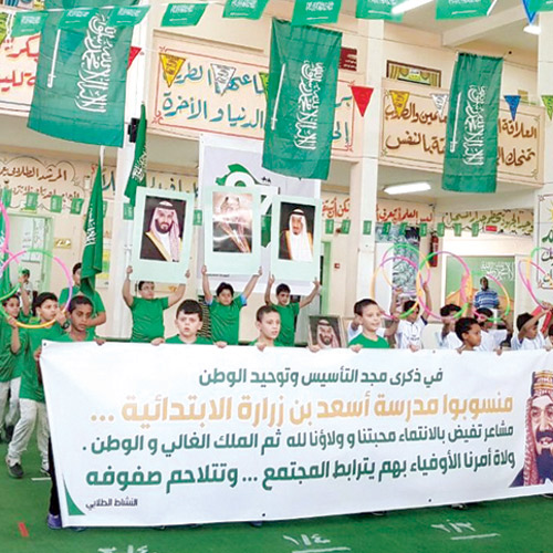 أقامت مدرسة أسعد بن زرارة الابتدائية بمكتب التعليم بشمال الرياض برنامج احتفاء باليوم الوطني الـ87، بحضور مساعد مدير مكتب التعليم بشمال الرياض للشؤون المدرسية الأستاذ صالح بن عبدالعزيز بن سلمة ورئيس وحدة النشاط الطلابي الأستاذ خالد بن إبراهيم الحيدري وقائد المدرسة الأستاذ عبدالعزيز العبدالجبار ووكيل المدرسة الأستاذ عبدالمحسن المصيبيح، ومشرف التربية الخاصة الأستاذ عثمان الربيعة ومعلمي المدرسة وأولياء الأمور وطلاب المدرسة.وبدأ الحفل بالقرآن الكريم، ثم السلام الوطني للمملكة مع العرض الرياضي وحمل الأعلام وصورالمؤسس الملك عبدالعزيز - طيب الله ثراه -، وصور لخادم الحرمين الشريفين الملك سلمان بن عبدالعزيز وولي عهده الأمين صاحب السموالملكي الأميرمحمد بن سلمان بن عبدالعزيز - حفظهما الله -، وحمل الطلاب لافتة بمناسبة الذكرى الوطنية للمملكة العربية السعودية وذلك تحت تدريب معلم التربية الرياضية الأستاذ سلطان العصيمي.ثم ألقى الأستاذ حمد العدواني كلمة المعلمين أعرب فيها عن حب الوطن والتطور الذي ساد المملكة منذ عهد المؤسس الملك عبدالعزيز - طيب الله ثراه - حتى عهد خادم الحرمين الملك سلمان بن عبدالعزيز - حفظه الله -.وتوالت فقرات الحفل من كلمات وقصائد ونشيد لفرسان الإلقاء سعوديتي ، وتم عرض مشهد تمثيلي بعنوان رؤية وطن بإشراف وتدريب الأستاذ عبدالمجيدالمطوع ومسابقة في الخط العربي بإشراف الأستاذ بدرالسهلي ومسابقة في الرسوم والفنون التشكيلية من إشراف الأستاذ إبراهيم أبوحيمد من ثم مشاهدة الفلم الوثائقي المعد بهذه المناسبة الغالية تحت إعداد وإشراف الأستاذ ماجد العتيق ورائد النشاط بالمدرسة الأستاذ إبراهيم الموسى، وثم قام الحضور بزيارة للخيمة الشعبية التراثية وشاهدوا ما تحتويه الخيمة من أدوات وأواني قديمة وأكلات شعبية تحت إشراف الأستاذ صالح العجلان ومن ثم أقيمت مباراة في كرة القدم على كأس المؤسس بعدها أقيمت العرضة السعودية.