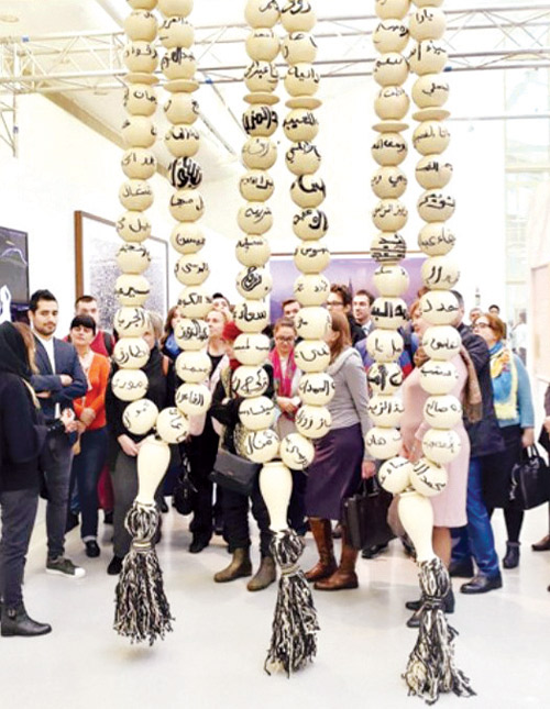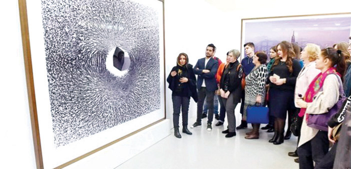 ولم يغب الفن التشكيلي عن الواقع الافتراضي إلى الواقع البصري الملموس؛ إذ انتقل زوَّار المعرض إلى صالة تضم 54 عملاً فنيًّا، قدمه أكثر من 34 فنانًا وفنانة سعوديين من رواد الفن الكلاسيكي والفن المعاصر بمدارس فنية مختلفة في عرضها ومتفقة في جمالها الحسي، وعمقها الإبداعي في فكرة الرسم، أو التصميم، أو الالتقاط. ويلفت نظر الزائر للمعرض الفني ثلاث مسباحات، توسطت المعرض بطول أربعة أمتار لكل مسباح، وعلى مقربة منها توجد لوحة المواضع السبعة في الصلاة المصنوعة من لوح الأكرليك والصمامات الكهربائية، وسجادتا الصلاة المصنوعتان من الداينامك المعدني بطول 150 في 70 سنتيمترًا، والمصنوعة من الأنسجة الصناعية.