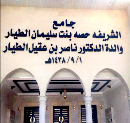 تم مؤخراً افتتاح جامع والدة الدكتور ناصر الطيار، السيدة حصة بنت سليمان الطيار -رحمها الله- بحي الياسمين في الرياض، الذي بني على أحدث طراز وأجمل عمارة فنيّة مكتسباً التصميم الإسلامي المميز، حيث يقع على مساحة تقدر بخمسة آلاف متر مربع، ويضم الجامع مساحة 60*33، ومصلى النساء 850 مترا مربعا، وفلّتان للإمام والمؤذن، و12 دورة مياه، ومواقف للسيارات، ويضم مئذنتين طول كل واحدة 80م، إضافة إلى الخدمات الأخرى المتنوعة الملحقة به.