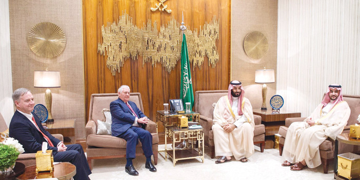 اجتمع صاحب السمو الملكي الأمير محمد بن سلمان بن عبدالعزيز ولي العهد نائب رئيس مجلس الوزراء وزير الدفاع في الرياض أمس مع معالي وزير الخارجية الأمريكي ريكس تيلرسون. وجرى خلال الاجتماع استعراض العلاقات الثنائية بين البلدين الصديقين، ومجالات تطويرها، إلى جانب بحث تطورات الأوضاع الإقليمية، والجهود المشتركة في مكافحة الإرهاب. حضر الاجتماع صاحب السمو الملكي الأمير خالد بن سلمان بن عبدالعزيز سفير خادم الحرمين الشريفين لدى الولايات المتحدة الأمريكية ومعالي وزير الدولة عضو مجلس الوزراء الدكتور مساعد بن محمد العيبان ومعالي وزير الخارجية الأستاذ عادل بن أحمد الجبير ومعالي رئيس الاستخبارات العامة الأستاذ خالد بن علي الحميدان. فيما حضره من الجانب الأمريكي القائم بأعمال سفارة الولايات المتحدة الأمريكية لدى المملكة كريستوفر هينزيل وعدد من المسؤولين بوزارة الخارجية الأمريكية.