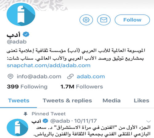 حساب الموسوعة العالمية للأدب العربي، مؤسسة ثقافية إعلامية تعنى بمشاريع توثيق ورصد الأدب العربي والعالمي.