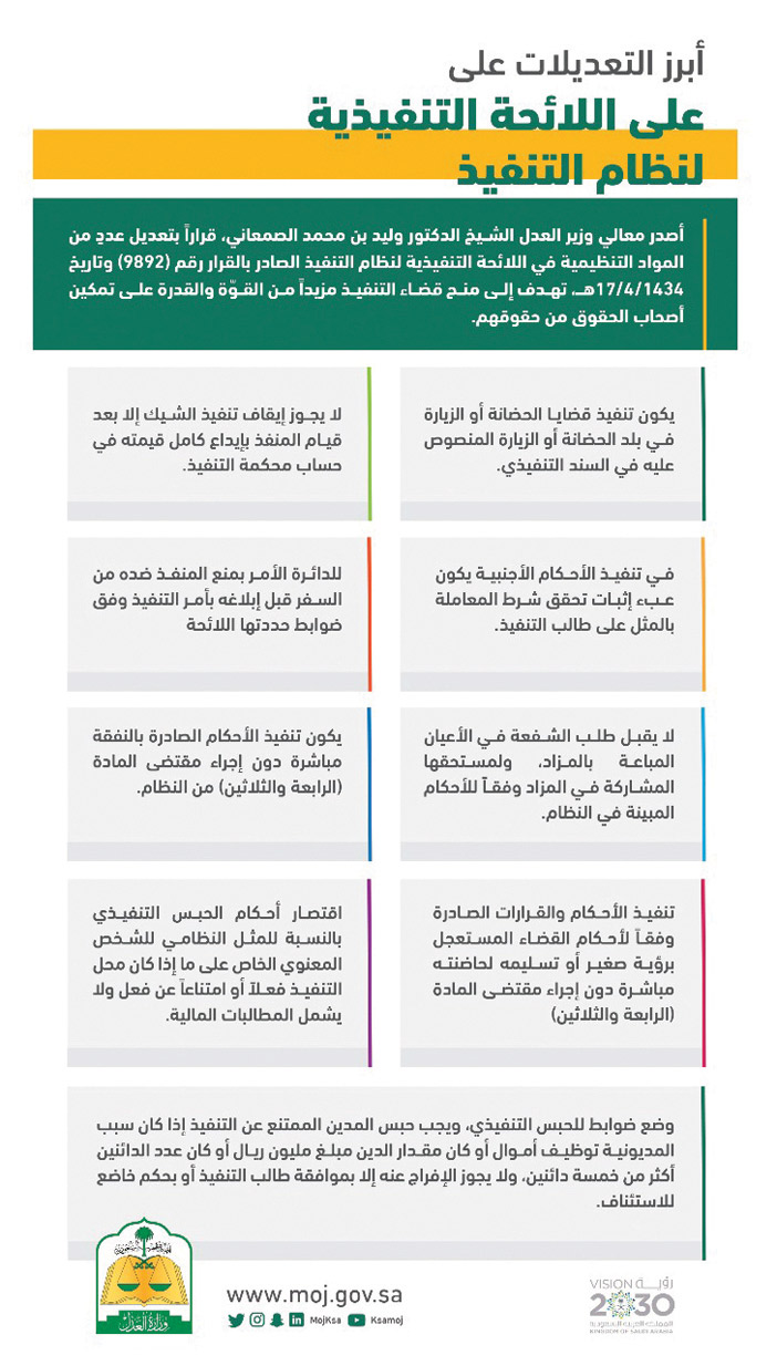 ومن أبرز التعديلات على لائحة التنفيذ أن يكون تنفيذ قضايا الحضانة أو الزيارة في بلد الحضانة أو الزيارة المنصوص عليه في السند التنفيذي، وألاّ يجوز إيقاف تنفيذ الشيك إلا بعد قيام المنفذ بإيداع كامل قيمته في حساب محكمة التنفيذ، إضافةً إلى أنّه في تنفيذ الأحكام الأجنبية يكون عبء إثبات تحقق شرط المعاملة بالمثل على طالب التنفيذ.
