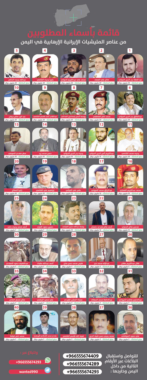 أعلنت المملكة عن أرقام التواصل للإبلاغ عن قائمة الـ ( 40 ) اسماً لقيادات وعناصر مسؤولة عن تخطيط وتنفيذ ودعم الأنشطة الإرهابية المختلفة في جماعة الحوثي الإرهابية، ورصدت مكافآت مالية (موضحة أمام اسم كل منهم)، لمن يدلي بأي معلومات تُفضي إلى القبض عليهم أو تحديد أماكن وجودهم.