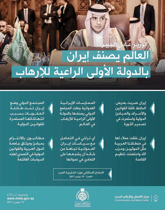 وأدان المجلس بشدة، عملية إطلاق صاروخ باليستى إيرانى الصنع من الأراضى اليمنية من قبل الميليشيات الموالية لإيران «الحوثي- صالح» والذى استهدف مدينة «الرياض» واعتبار ذلك عدوانا صارخا ضد المملكة وتهديدا للأمن القومى العربى وأكد المجلس، على حق المملكة فى الدفاع الشرعى عن أراضيها وفق ما نصت عليه المادة 51 من ميثاق الأمم المتحدة ومساندتها فى الإجراءات التى تقرر اتخاذها ضد تلك الانتهاكات الإيرانية فى إطار الشرعية الدولية وإدانة جميع الأعمال الإرهابية التى تقوم بها إيران فى البحرين وآخرها تفجير خط أنابيب النفط البحرينى واعتباره عملا إرهابيا قامت به مجموعة مدعومة من إيران والحرس الثورى الإيرانى، واستنكر المجلس وأدان التدخلات الإيرانية المستمرة فى الشئون الداخلية للبحرين من خلال مساندة الإرهاب وتدريب الإرهابيين وتهريب الأسلحة والمتفجرات وإثارة النعرات الطائفية ومواصلة التصريحات على مختلف المستويات لزعزعة الأمن والنظام والاستقرار وتأسيسها جماعات إرهابية بالبحرين ممولة ومدربة من الحرس الثورى الإيرانى وحزب الله اللبنانى الإرهابى والذى يتنافى مع مبدأ حسن الجوار وعدم التدخل فى الشؤون الداخلية وفقا لمبادئ ميثاق الأمم المتحدة والقانون الدولى وأكد مجلس جامعة الدول العربية، فى قراره، على دعم البحرين فى جميع ما تتخذه من إجراءات وخطوات لمكافحة الإرهاب والجماعات الإرهابية للحفاظ على أمنها واستقرارها، وأشاد المجلس بجهود الأجهزة الأمنية بالمملكة والبحرين التى تمكنت من إحباط العديد من المخططات الإرهابية وإلقاء القبض على أعضاء المنظمات الإرهابية الموكل إليها تنفيذ تلك المخططات والمدعومة من قبل الحرس الثورى الإيرانى وحزب الله اللبنانى الإرهابى، وأدان المجلس استمرار احتلال إيران للجزر الإماراتية الثلاث (طنب الكبرى وطنب الصغرى وأبوموسى ) وتأييد كافة الإجراءات والوسائل السلمية التى تتخذها دولة الإمارات العربية المتحدة لاستعادة سيادتها على جزرها المحتلة طبقا للقانون الدولى، واستنكرالمجلس سياسة الحكومة الإيرانية وتدخلاتها المستمرة فى الشئون العربية، والتى من شأنها تغذية النزاعات الطائفية والمذهبية والتأكيد على ضرورة امتناعها عن دعم الجماعات التى تؤجج هذه النزاعات وبالذات فى دول الخليج العربى ومطالبتها بإيقاف دعم وتمويل الميليشيات والأحزاب المسلحة فى الدول العربية وخاصة تدخلاتها فى الشأن اليمنى والتقف عن دعمها للميليشيات الموالية لها والمناهضة لحكومة اليمن الشرعية ومدها بالأسلحة وتحويلها إلى منصة لإطلاق الصواريخ على جيران اليمن وتهديد الملاحة البحرية فى مضيق باب المندب والبحر الأحمر وهو ما ينعكس سلبا على أمن واستقرار اليمن ودول الجوار والمنطقة بشكل عام، ويعتبر خرقا واضحا لقرار مجلس الأمن 2216.