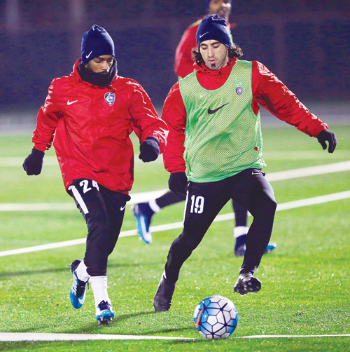منع مدرب الهلال رامون دياز الإعلاميين من حضور تدريب الفريق أمس الأربعاء، حيث فضل المدرب أن يأخذ التدريب طابع السرية، وتركزت التدريبات الهلالية التي كانت في أجواء باردة وممطرة على الجوانب اللياقية والفنية، إذ عمد المدرب على تطبيق بعض الجمل الفنية قبل أن يضع مناورة على منتصف الملعب، وقد تابع تدريبات الفريق الأمير نواف بن سعد ونائبه المهندس عبدالرحمن النمر.