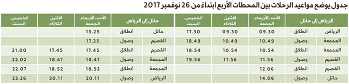وأضاف أن الرحلات من وإلى حائل ستكون في أيام الأحد والأربعاء والجمعة من كل أسبوع ذهاباً وإياباً، مبيناً أن موعد انطلاق الرحلات من محطة حائل سيكون في الساعة 3.25 عصراً على أن يصل القطار إلى وجهته الأخيرة بمحطة الرياض في الساعة 8.11 مساء.