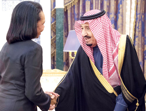 استقبل خادم الحرمين الشريفين الملك سلمان بن عبدالعزيز آل سعود -حفظه الله- في مكتبه بقصر اليمامة في الرياض أمس، وزيرة الخارجية الأمريكية الأسبق الدكتورة كونداليزا رايس. وتم خلال الاستقبال، تبادل الأحاديث حول عدد من الموضوعات. حضر الاستقبال، صاحب السمو الملكي الأمير عبدالعزيز بن سعود بن نايف بن عبدالعزيز وزير الداخلية، ومعالي وزير الدولة عضو مجلس الوزراء رئيس الديوان الملكي الأستاذ خالد بن عبدالرحمن العيسى.