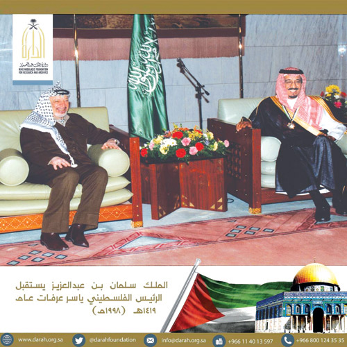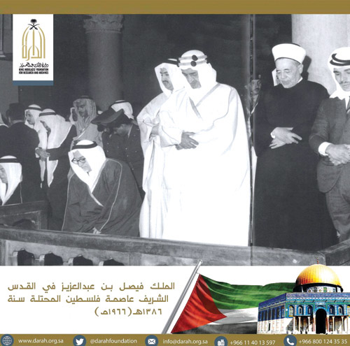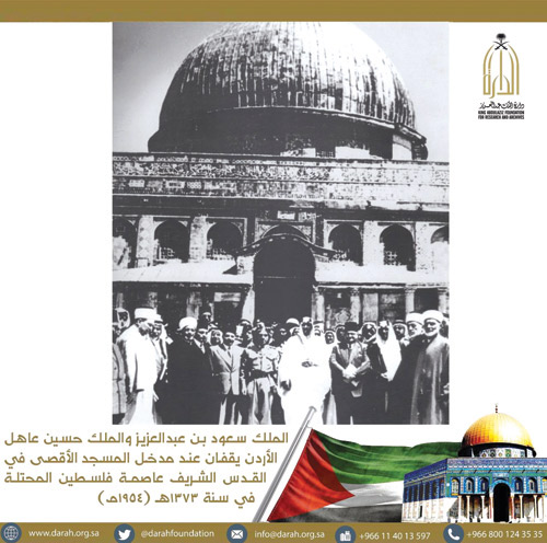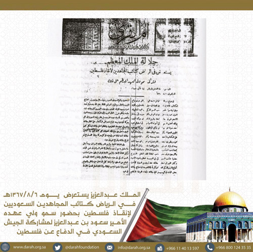 بدأت دارة الملك عبدالعزيز، بإطلاق مجموعة صور تاريخية عن دور المملكة عن موقف المملكة من قضية فلسطين على حسابها الرسمي في تويتر darahfoundation@، التي تعكس الجوانب التاريخية المختلفة ومواقف ملوك المملكة العربية السعودية خلال العقود الماضية من عهد المؤسس الملك عبد العزيز -رحمه الله-، إلى عهد خادم الحرمين الشريفين الملك سلمان بن عبد العزيز آل سعود -حفظه الله-. كما سينشر الحساب الذي يتابعه مغردون من مختلف الأطياف الثقافية والعلمية من داخل المملكة وخارجها من المهتمين بالتاريخ ومصادره والباحثين عن المعلومة التاريخية الموثقة ومن خلال صور تاريخية ووثائق رسمية ومقاطع فيديو تاريخية من فيلم (نداء الشهامة.. الجيش السعودي في فلسطين 1367هـ 1948م) من إنتاج دارة الملك عبد العزيز.
