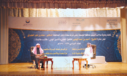 بحضور وكيل محافظة المجمعة الدكتور عناد بن نجر العجرفي، والسفير أحمد بن حمد اليحيى، ومدير التعليم بمحافظة المجمعة الدكتور صالح بن محمد الربيعة، وجمع من المسؤولين وقادة المدارس ورجال التربية والتعليم، نُظِّم صباح يوم الخميس الماضي حفل جائزة أحمد بن حمد اليحيى للتفوق العلمي والتميُّز المهني بمحافظة المجمعة، وذلك بحفل خطابي، احتضنه مسرح إدارة التعليم بالمحافظة.