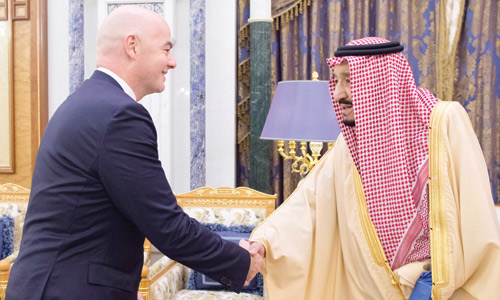استقبل خادم الحرمين الشريفين الملك سلمان بن عبدالعزيز آل سعود -حفظه الله- في مكتبه بقصر اليمامة في الرياض أمس رئيس الاتحاد الدولي لكرة القدم (فيفا) جياني إنفانتينو. وتم خلال الاستقبال استعراض أبرز برامج الاتحاد الدولي لتطوير لعبة كرة القدم، ومجالات التعاون المشترك بين الاتحاد الدولي لكرة القدم والهيئة العامة للرياضة في المملكة. حضر الاستقبال معالي وزير الدولة عضو مجلس الوزراء رئيس الديوان الملكي الأستاذ خالد بن عبدالرحمن العيسى، ومعالي وزير الخارجية الأستاذ عادل بن أحمد الجبير، ومعالي المستشار في الديوان الملكي رئيس مجلس إدارة الهيئة العامة للرياضة الأستاذ تركي بن عبدالمحسن آل الشيخ.