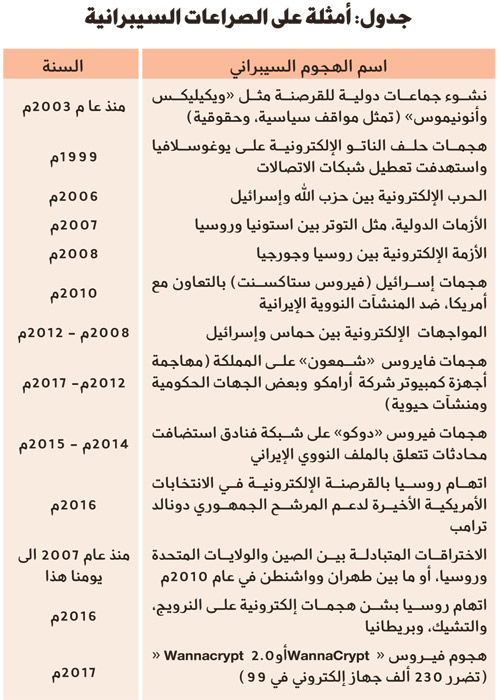 وتعتبر الحرب السيبرانية غامضة الأهداف مجهولة المصدر تتحرك عبر شبكات المعلومات والاتصالات عالميا وتستخدم أسلحة إلكترونية تستهدف تقنية المعلومات، حيث يتم توجيهها ضد المنشآت الحيوية، أو دسها عن طريق عملاء أجهزة الاستخبارات والطرف الذي يتمتع بقوة هجومية ويبادر بعنصر المباغتة سيكون له الغلبة بغض النظر عن حجم قدراته العسكرية التقليدية، الأمر الذي يناقض نظريات الردع الإستراتيجي وتختلف عن الحرب التقليدية التي تستخدم فيها الجيوش النظامية ويسبقها إعلان لحالة الحرب.