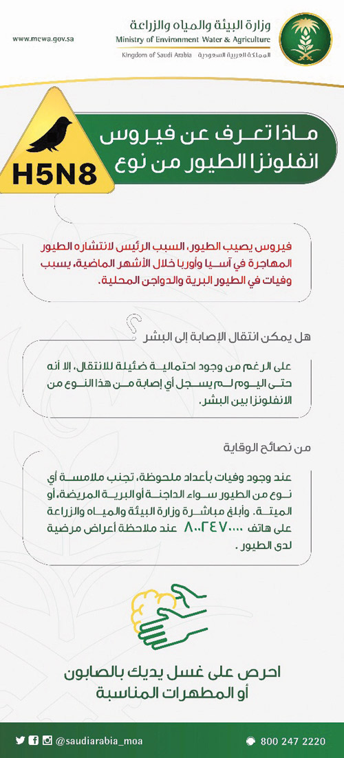 وطمأنت الوزارة أنها تواصل أعمالها الدورية في الفحص والتقصي لمشاريع الدواجن، وأسواق الطيور في كافة مناطق المملكة، حرصاً على سلامة المستهلكين والمخالطين، ومشاريع الثروة الحيوانية.