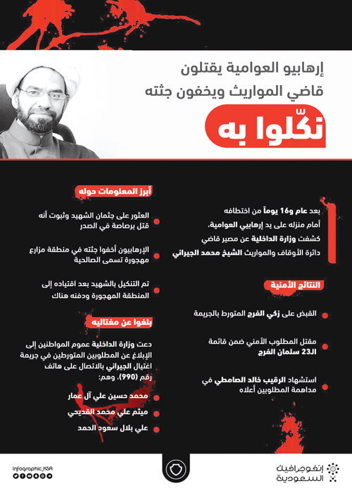 كشف المتحدث الأمني بوزارة الداخلية اللواء منصور التركي أن سبب التأخر في الوصول إلى جثمان الشيخ محمد بن عبدالله الجيراني قاضي دائرة الأوقاف والمواريث من أمام منزله ببلدة تاروت صباح يوم الثلاثاء الموافق 14 / 3 / 1438هـ والمعلن عنها بتاريخ 1438/3/15هـ، هو عملية الإجراءات الأمنية والتحقيقات للكشف عن هوية عدد من المتورطين في هذه الجريمة، مبيناً أن تحقيقات الجهات الأمنية كانت مستمرة بالتحقيق في كافة القضايا سواء كانت إرهابية أو قضايا جنائية ولم تتوفر معلومات مؤكدة عن مقتل الشيخ بالإضافة لعدم توفر معلومات.