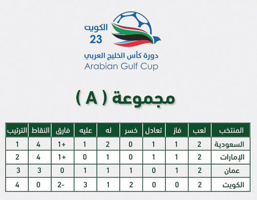 ودعت الكويت صاحبة الضيافة منافسات كأس الخليج (خليجي 23) بعد الخسارة 1 - صفر من عمان أمس والتي أحيت آمالها بالتأهل لنصف النهائي بهذا الفوز الثمين على صاحب الأرض والجمهور، حيث تعتبر هذه هي الهزيمة الثانية على التوالي للكويت التي خسرت 2 - 1 من السعودية في الجولة الافتتاحية لتتذيل ترتيب المجموعة. جاء الهدف من ركلة جزاء نفذها أحمد مبارك (كانو) في الدقيقة 58 لتعوض عمان خسارتها 1 - صفر من الإمارات وتحصد أول ثلاث نقاط، ليتأجل حسم بطاقتي التأهل للدور قبل النهائي إلى الجولة الأخيرة.