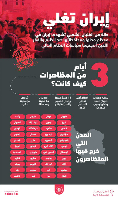 وقد تواصلت المظاهرات السلمية في إيران أمس لليوم الرابع على التوالي احتجاجًا على المصاعب الاقتصادية وتفشي الفساد في النظام الإيراني.