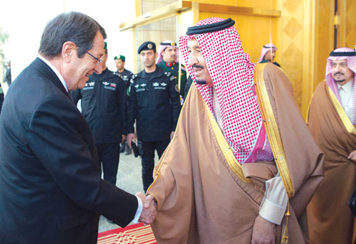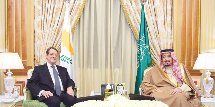 عقد خادم الحرمين الشريفين الملك سلمان بن عبدالعزيز آل سعود -حفظه الله- في قصر اليمامة بالرياض أمس، جلسة مباحثات رسمية مع فخامة الرئيس نيكوس اناستاسيادس رئيس جمهورية قبرص. وجرى خلال الجلسة استعراض العلاقات الثنائية، وسُبل تعزيز وتنمية التعاون بين المملكة وقبرص في مختلف المجالات. كما تم بحث مستجدات الأحداث في المنطقة التي تطابقت وجهات نظر البلدين حيالها.