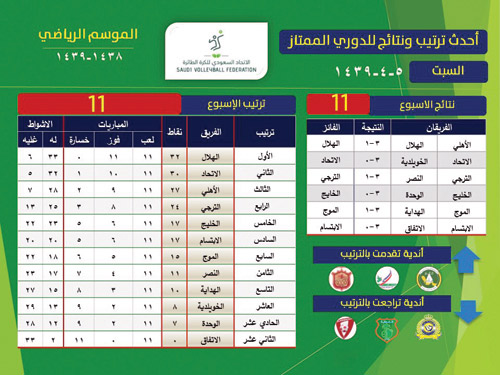 أُسدل الستار على القسم الأول من الدوري الممتاز للكرة الطائرة بمشاركة 12فريقًا، واستطاع الهلال أن يتصدر ترتيب الفرق بعد فوزه في جميع المباريات بمجموع 32 نقطة من أصل 33 نقطة.