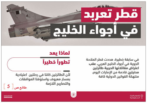 وقد عبر مصدر مسؤول بوزارة الخارجية عن إدانة المملكة العربية السعودية لاعتراض مقاتلات قطرية لطائرتين مدنيتين إماراتيتين متجهتين إلى عاصمة مملكة البحرين المنامة، وذلك حسب ما جاء في بيان الهيئة العامة للطيران المدني الإماراتية.
