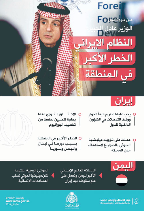 حمَّل معالي وزير الخارجية الأستاذ عادل بن أحمد الجبير مسؤولية تردي الأوضاع الإنسانية في اليمن إلى ميليشيا الحوثي المدعومة من إيران. وأشار الجبير في مؤتمر صحافي أمس الثلاثاء مع نظيره البلجيكي ديديه ريندرز في مقر وزارة الخارجية البلجيكية بالعاصمة بروكسل بالقول إن ميليشيا الحوثي تتحمل المسؤولية في تردي الأوضاع الإنسانية في اليمن، فهي من اختطفت البلاد وأرسلت الأطفال كجنود في ساحات المعارك.