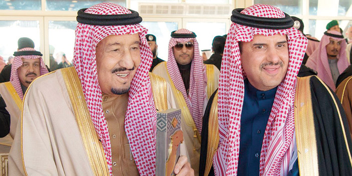 ولدى وصول خادم الحرمين الشريفين مقر المهرجان، كان في استقباله - حفظه الله - صاحب السمو الملكي الأمير محمد بن سلمان بن عبد العزيز ولي العهد نائب رئيس مجلس الوزراء المشرف العام على نادي الإبل، وصاحب السمو الملكي الأمير عبد العزيز بن سعود بن نايف بن عبد العزيز وزير الداخلية، ومعالي الأمين العام المكلف لدارة الملك عبد العزيز المشرف العام على مهرجان الملك عبد العزيز للإبل الدكتور فهد بن عبد الله السماري وعدد من المسؤولين.