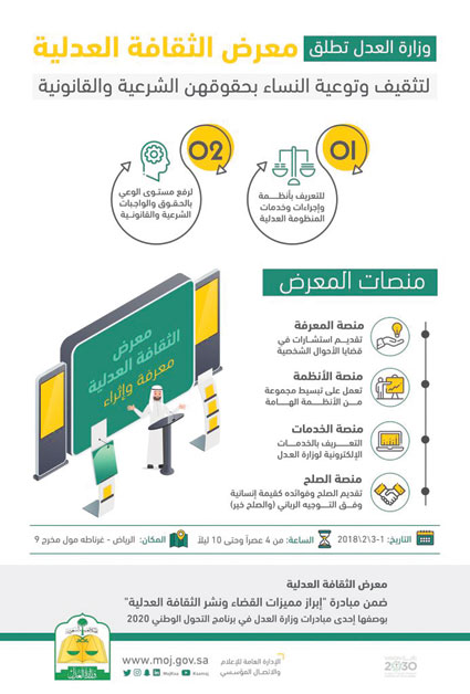 وأكد الخميس أن المعارض التثقيفية تأتي ضمن مبادرة «إبراز مميزات القضاء ونشر الثقافة العدلية»، بوصفها إحدى مبادرات الوزارة في برنامج التحول الوطني 2020، مبيناً أن المعرض الأول يتضمن منصات معرفية وتفاعلية، تراعي الجوانب التوعوية التي تكثر حاجة المجتمع إليها، موضحاً أن المعرض يعمل عليه مجموعة من الأخصائيات في مجالات الشريعة والقانون والاجتماع.
