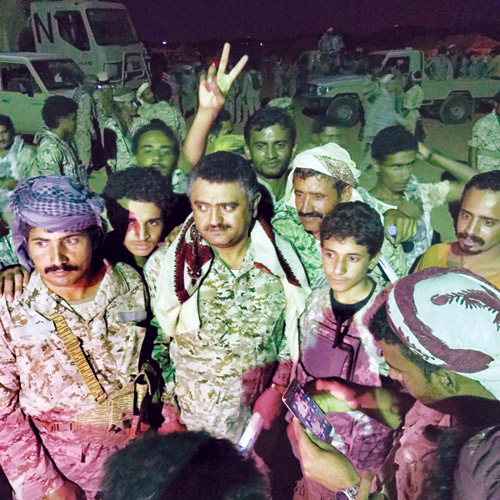 وعن دور التحالف العربي في مساندة القتال في الجبهات قال: دور التحالف قوي ومساند لنا في كل الجبهات وهم يساندوننا بالضرب الناري والاداري.. ولم يقصروا معنا اطلاقاً كلما نطلب منهم شيئا نجد الاستجابة، والطيران على مدار الساعة ونجاح القتال في الجبهات بفضل من الله ثم بجهود التحالف وعلى رأسهم المملكة العربية السعودية التي وجدنا منهم كل دعم ووجدنا في توجيهات الأمير محمد بن سلمان لمشايخ القبائل وحرص المملكة على تحرير اليمن عاملا من عوامل التقدم العسكري على كافة الجبهات، وان الدافع الذي جعل المشايخ يساندون الشرعية وقوات التحالف هو ما لمسناه من ولي العهد وزير الدفاع عندما قابلناه وجدنا أن سموه حريص على استقرار اليمن وبث الأمن والاستقرار والحفاظ على وحدة وأراضي اليمن.