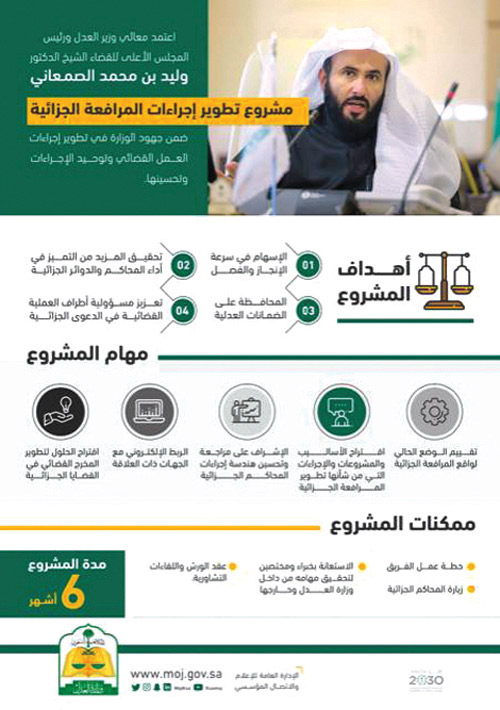 وجه معالي وزير العدل الشيخ الدكتور وليد الصمعاني بتشكيل فريق متخصص لإدارة مشروع «تطوير إجراءات المرافعة الجزائية»، بهدف الإسهام في سرعة الإنجاز والفصل في القضايا، وتحقيق المزيد من التميز في أداء المحاكم والدوائر الجزائية، والمحافظة على الضمانات العدلية، وتحقيق التوافق مع مسؤولية أطراف العملية القضائية في الدعاوى.