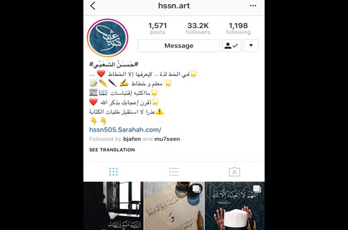 خطاط ومعلم، حسابه غني باقتباسات بالخط العربي، يشير من خلالها إلى التقنيات والتطبيقات التي استخدمها إضافة إلى الأدوات كنوع الورق والحبر.
