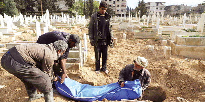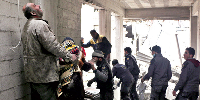 كما قتل أمس الخمسي تحديدا 59 مدنيا في غارات جوية وإطلاق صواريخ استهدفت العديد من بلدات الغوطة ومدنها وخصوصا دوما حيث قضى37 شخصا بحسب المرصد. وأعربت المملكة العربية السعودية أمس عن قلقها العميق إزاء استمرار تصاعد هجمات النظام السوري على الغوطة الشرقية، وأثر ذلك على المدنيين. وشدد مصدر مسؤول بوزارة الخارجية على ضرورة وقف النظام السوري للعنف وإدخال المساعدات الإنسانية والإغاثية، والأخذ بشكل جاد بمسار الحل السياسي للأزمة، وفق المبادئ المتفق عليها والمتمثلة في إعلان جنيف1 وقرار مجلس الأمن الدولي 2254. وفي تصعيد خطير رفضت روسيا أمس الخميس وقفاً إنسانياً لإطلاق النار يستمر 30يوماً بهدف السماح بإيصال المساعدات الانسانية وإجلاء الجرحى..وقالت أن(لا اتفاق) في مجلس الامن الدولي على وقف لإطلاق النار في سوريا يستمر ثلاثين يوما. وندد السفير الروسي فاسيلي نيبينزيا خلال جلسة للمجلس أمس دعت اليها موسكو بـ(الخطب الكارثية) التي تذكر بما قاله أعضاء في المجلس خلال المعارك في مدينة حلب نهاية2016معتبراً انها لا تنسجم مع الوضع على الارض. غير أن نظيره السويدي اولوف سكوغ أكد إثر الاجتماع ان المناقشات ستستمر مبدياً امله في طرح مشروع قرار أعدته بلاده والكويت على التصويت اليوم الجمعة علماً بأنه ينص على وقف لإطلاق النار يستمر شهراً. ودانت في المقابل الولايات المتحدة وفرنسا موقف روسيا الداعم للنظام السوري وانتقد السفير الفرنسي فرنسوا دولاتر(الهجمات على المستشفيات) و(الوضع الذي لا يمكن القبول به) معتبراً أن (الوضع على الارض ملح جداً) و(من الضروري أن يتم سريعاً تبني) مشروع القرار الذي يتفاوض في شأنه الاعضاء الـ15 في مجلس الامن..وحذر ايضا من(الاسوأ) ما يعني(اتساع النزاع). بدوره هدد المندوب السوري بشار الجعفري مدعوماً بحليفه الروسي خلال مداخلته في جلسة مجلس الأمن أمس بجعل الغوطة الشرقية كـ(مدينة حلب) في إشارة إلى معركة حلب العام2016. ووقال الجعفري في مداخلته نعم، ستصبح الغوطة الشرقية (حلباً اخرى) موضحاً أن حلب اليوم (هي ملايين الناس الذين يعيشون في شكل طبيعي تمااً)،متوقعا أن تصبح ادلب بدورها حلبا أخرى. وأشار إلى أن (مئات من الصواريخ وقذائف الهاون) سقطت أمس الخميس على دمشق.
