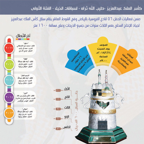 يرعى خادم الحرمين الشريفين الملك سلمان بن عبدالعزيز آل سعود الرئيس الفخري لنادي الفروسية، مساء اليوم السبت، المهرجان السنوي الكبير لسباق الخيل على كأس المؤسس الملك عبدالعزيز بن عبدالرحمن آل سعود لجياد الإنتاج المحلي وذلك على ميدان الملك عبدالعزيز للفروسية بالجنادرية.