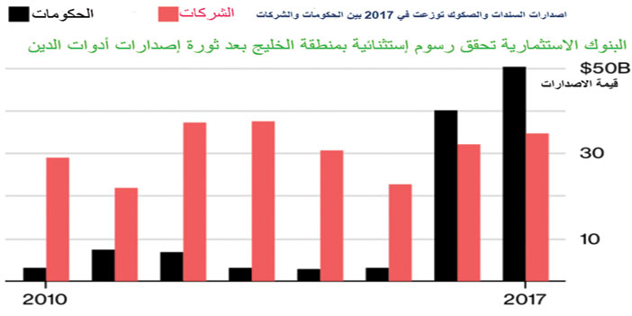 o بلغت رسوم البنوك الاستثمارية بالشرق الأوسط في 2017 ما يصل إلى 912 مليون دولار، منها 256 مليون دولار قادمة من جراء ترتيب إصدارات أدوات الدين (وهي الأعلى منذ 2000). (المصدر: رويترز)