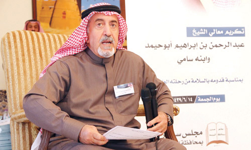 في يوم من أيام الوفاء والمحبة والعطاء احتفى أعضاء مجلس سدير بمحافظة المجمعة بمعالي الشيخ عبد الرحمن بن إبراهيم أبو حيمد رئيس مجلس إدارة مؤسسة الجزيرة للصحافة والطباعة والنشر وابنه الأستاذ سامي بمناسبة عودته إلى أرض الوطن بعد رحلة الاستجمام التي قضاها خارج البلاد بعد العملية الجراحية التي أجريت له مؤخراً بمستشفى الملك فيصل التخصصي بالرياض وهي عبارة عن زراعة كلية تبرع بها ابنه البار سامي وقد أقيم الحفل في مزرعة الشيخ عبد الرحمن أبو حيمد (العنبرية) بعودة سدير وحضره قرابة خمسين عضوا من أعضاء المجلس وقد أقيم حفل خطابي بهذه المناسبة. قدم فقراته الزميل يوسف بن محمد العتيق الذي تحدث عن الكثير من الأمور وأهمها الوفاء لمن يستحق الوفاء. وقد بدأ الحفل بالقران الكريم ثم كلمة المشرف العام على المجلس الأستاذ عبد الله بن محمد أبابطين رحب فيها بالحضور واستعرض مناقب الشيخ عبد الرحمن أبو حيمد ومواقفه الإنسانية والخيرية سواء في عودة سدير أو غيرها واستعرض بعض مواضيع الكتاب الذي أصدره المجلس بهذه المناسبة بعنوان (المجد عوفي إذ عوفيت والكرم) شارك فيه عدد من أعضاء المجلس بكلمات مختلفة عبروا فيها عن مشاعرهم تجاه الشيخ عبدالرحمن أبوحيمد وتمنوا له الصحة والعافية كما استعرض أبابطين بعض مناشط المجلس خلال سنة ونصف من تأسيسه بعد ذلك ألقى الشيخ الدكتور محمد بن عبدالرحمن العمر كلمة هنأ في مستهلها أبو حيمد على سلامة الوصول ثم تحدث عن بعض الأمور الاجتماعية وعن بر الوالدين بعده ألقى الشاعر حمد المغامس قصيدة نبطية بهذه المناسبة نالت استحسان الحضور ثم ألقى الأستاذ محمد بن عبدالمحسن الجماز كلمة هنأ فيها أبوحيمد على شفائه وتمنى له الصحة والعافية وطرح مبادرة من لجنة التنمية الاجتماعية بحِرمه التي يرأسها عبارة عن إقامة دورات قصيرة للراغبين في بعض المهن مثل الكهرباء والسباكة وغيرهما من أجل أن يستطيع الشخص عمل الإعمال البسيطة في منزله وقد رحب الجميع بهذه الفكرة وتمنوا أن تترجم إلى واقع فعلي قريبا إن شاء الله عقب ذلك ألقى المحتفى به الشيخ عبدالرحمن أبو حيمد كلمة مؤثرة شكر في مستهلها أعضاء المجلس على هذه البادرة التي قال إنها لاتستغرب منهم ثم استعرض مراحل مرضه والعملية التي أجريت له وفترة الاستجمام التي قضاها خارج الوطن وذكر أن جميع أبنائه تسابقوا على التبرع له إلا أن الابن سامي كان هو الأنسب صحيا وطلب من الجمع الدعاء له ثم تم توزيع نسخه من الكتاب على الحضور تلاه تقديم الدروع والهدايا لمعالي الشيخ عبدالرحمن وابنه الأستاذ سامي وفي نهاية الحفل تم التقاط الصور التذكارية بهذه المناسبة بعدها توجه الجميع لتناول طعام الغداء المعد بهذه المناسبة وبعد صلاة العصر قام الجميع بزيارة لملتقى عبدالله بن محمد أبابطين الثقافي بمزرعته (العائذية) بروضة سدير كما زاروا مكتبة سدير الوثائقية والمتحف التراثي ومعارض الوثائق والمجلات والصحف والنخلة.
