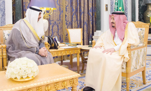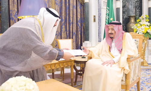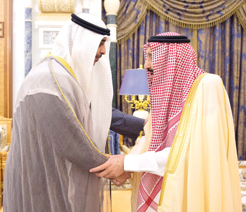 تسلم خادم الحرمين الشريفين الملك سلمان بن عبد العزيز آل سعود -حفظه الله- رسالة خطية من أخيه صاحب السمو الشيخ صباح الأحمد الجابر الصباح أمير دولة الكويت الشقيقة نقلها معالي الشيخ محمد العبد الله المبارك الصباح نائب وزير شؤون الديوان الأميري بدولة الكويت، تضمنت تحيات سموه وتقديره وشكره وشكر الشعب الكويتي الشقيق لخادم الحرمين الشريفين - رعاه الله - على المشاركة الفعّالة للمملكة في أفراح الكويت واحتفالاتها بأيامها الوطنية على المستويين الرسمي والشعبي.