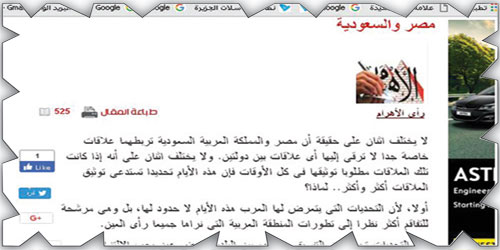 وقالت: من تكرار القول التذكير بأن الدولتين هما الأكبر والأهم فى المنظومة العربية الحالية مما يستوجب ضرورة عملهما معا لحماية هذه المنظومة. وأرجعت الجريدة ضرورة توثيق العلاقات بين البلدين إلى أن الأمن القومى العربى بات الآن على حافة الخطر، ولم يعد مقبولا أن تعمل كل دولة على حدة للحفاظ عليه، ومن ثم أصبح من الضرورى تكاتف الجميع لتوحيد الصف العربي، «فما بالنا لو كان هؤلاء الجميع ينظرون الآن لمصر والمملكة باعتبارهما القوتين الأكبر على الساحة العربية؟»