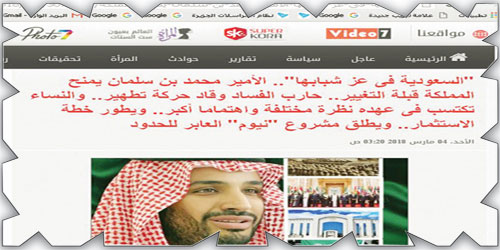 تحت عنوان «السعودية في عز شبابها.. الأمير محمد بن سلمان يمنح المملكة قبلة التغيير»، قالت صحيفة اليوم السابع، أن صعود صاحب السمو الملكى الأمير محمد بن سلمان بن عبد العزيز، ولى عهد المملكة، يمثل تحولاً كبيرًا على كافة الأصعدة خاصة الصعيدين الاجتماعى والثقافى، إذ تنتقل السلطة بذلك إلى جيل أصغر كثيرًا أقرب إلى الشباب ذات الأفكار الطموحة، مضيفة أنه يعمل على ملفات شديدة الأهمية، منها استحداث خطط للتحول الاقتصادى بالمملكة وعدم اعتمادها على النفط فقط. فضلاً عن محاربته للفساد ومحاسبة الفاسدين ومنهم أمراء، بالإضافة إلى الاهتمام بدور المرأة فى المجتمع السعودى.