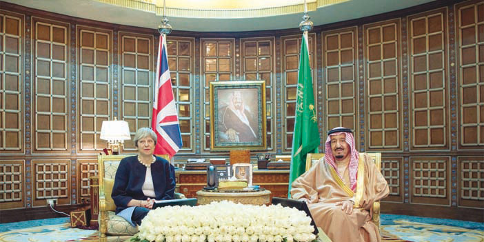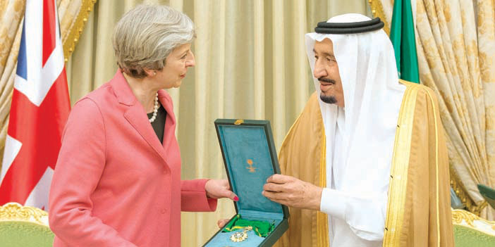 كما استقبل - رعاه الله - في أبريل 2017 م، بقصر اليمامة في الرياض دولة رئيسة وزراء بريطانيا تيريزا ماي، وعقد الجانبان جلسة مباحثات رسمية استعرضت خلالها العلاقات الثنائية وأوجه التعاون بين البلدين الصديقين في شتى المجالات، وسبل تطويرها وتعزيزها، إضافة إلى بحث مستجدات الأوضاع الإقليمية والدولية.