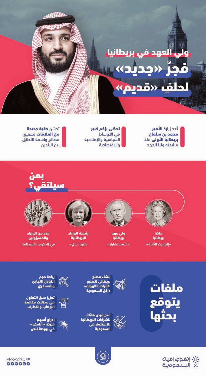 دفعٌ جديدٌ بمسيرة العلاقات، وتعزيز للصداقة بين المملكة العربية السعودية والمملكة المتحدة؛ تجسده الزيارة الرسمية التي يبدأها صاحب السمو الملكي الأمير محمد بن سلمان بن عبد العزيز ولي العهد نائب رئيس مجلس الوزراء وزير الدفاع - حفظه الله - ضمن زيارة تشكل حلقة في سلسلة توثيق عرى التعاون وبحث مجالات الاستثمار وفرص تنمية المستقبل الاقتصادي للمملكة كقوة اقتصادية عالمية، ولضمان استدامة نموها وتطورها في ضوء رؤية 2030.