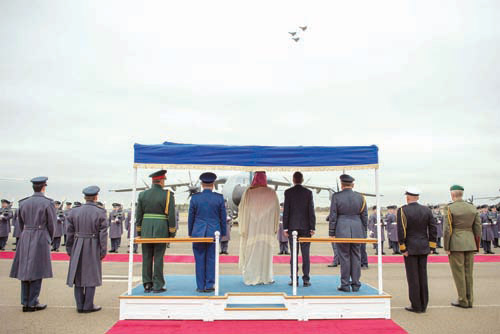 وفور وصول سمو ولي العهد حلقت في سماء القاعدة طائرات التايفون ترحيبًا بسموه، ثم عزف السلامان الوطنيان، واستعراض حرس الشرف.