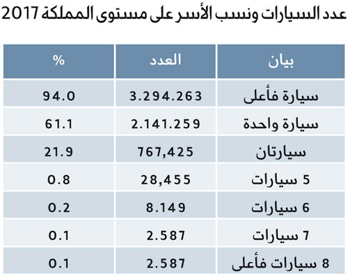ويقدر عدد الأسر بالمملكة حسب مسح 2017 بحوالي 3.5 مليون أسرة، هذه الأسر تمتلك حوالي 3.3 مليون سيارة، بمعنى أن نسبة تملك السيارات تقدّر بنحو 94 %، وهي نسبة عالية للغاية، بمعنى أن نسبة 6 % فقط من الأسر بالمملكة هي التي لا تمتلك سيارات، وهذه النسبة يفترض أن تكون أعلى من 6 %، لأنه من المؤكد أن هناك أسراً لا تحتاج للسيارة سواء أنها تقيم في نفس موقع عملها أو أن هناك أسراً مستواها المادي ضعيف أو أن هناك أسراً لا يستطيع أفرادها قيادة السيارة، مثل المعاقين أو كبار السن. وبلغ عدد الأسر التي تمتلك سيارة واحدة حوالي 2.1 مليون أسرة، بنسبة 61.1 % من إجمالي الأسر بالمملكة، وهي أيضاً نسبة مرتفعة. ووصل عدد الأسر التي تمتلك سيارتين حوالي 767.4 ألف أسرة بنسبة 21.9 % من إجمالي الأسر. أما الشيء اللافت أن عدد الأسر التي تمتلك 5 سيارات فأعلى بالمملكة وصل إلى 41.8 ألف أسرة، منها حوالي 2587 أسرة تمتلك 8 سيارات فأعلى، وهذه نقطة مثيرة للجدل، لأن متوسط عدد أفراد الأسر بالمملكة دائماً ما يكون ما بين 5-6 أفراد، إلا أن هؤلاء الأفراد دائماً بينهم 2-3 من صغار السن تحت سن القيادة، وبالتالي، فإن امتلاك 5 سيارات فأعلى يؤكد أن الفرد الواحد بالأسرة يقود سيارتين على الأقل في هذه الأسر. ويبلغ عدد الأسر التي تمتلك سيارات بمنطقة الرياض 792.5 ألف أسرة، رغم أن إجمالي عدد الأسر بالرياض لا يزيد عن 829.7 ألف أسرة، أي أن نسبة تمتلك السيارات بالرياض تبلغ 96 % تقريباً. فالدلالة الأولى بمدينة الرياض ليس بها فقراء، قياساً بمؤشر تمتلك السيارات. فتملك السيارات أحد أهم دلالات الرفاهية الاقتصادية وارتفاع المقدرة الشرائية للأفراد. ومن المتوقع أن يرتفع هذا المؤشر كثيراً خلال 2018، مع السماح للمرأة بقيادة السيارات، فإذا كانت نسبة تملك السيارات تصل إلى 94 % بالمملكة ولم يكن مسموحاً للمرأة بالقيادة في الماضي، فكيف ستكون نسبة التملّك بعد السماح لها بالقيادة كما هو الواقع حالياً. تعتقد «وحدة أبحاث الجزيرة» أن هذه النسبة ستصل قريباً إلى 100 %.