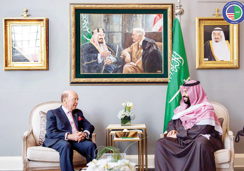 اجتمع صاحب السمو الملكي الأمير محمد بن سلمان بن عبدالعزيز ولي العهد نائب رئيس مجلس الوزراء وزير الدفاع، مع وزير التجارة الأمريكي ويلبر روس، ونائب وزير الخارجية جون سوليفان ، والرئيس التنفيذي لغرفة التجارة الأمريكية توم دونوهيو ونوقشت خلال الاجتماعات أهمية تطوير الشراكة السعودية الأمريكية، وزيادة حجم التبادل التجاري، وتطوير شراكات جديدة تسهم في مزيد من نمو اقتصاديات البلدين. حضر الاجتماعات صاحب السمو الملكي الأمير خالد بن سلمان بن عبدالعزيز سفير خادم الحرمين الشريفين لدى الولايات المتحدة الأمريكية والوفد الرسمي المرافق لسمو ولي العهد.