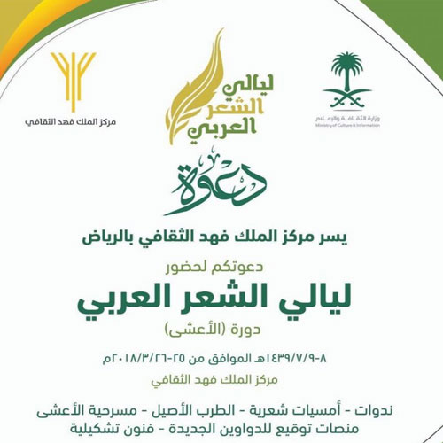 تنطلق فعاليات ليالي الشعر العربي (دورة الأعشى) التي ينظمها مركز الملك فهد الثقافي بالرياض اليوم، وذلك ضمن برنامج المركز الثقافي والفني. وستتضمن الفعاليات ندوات وأمسيات شعرية، تبدأ بقصيدة شعرية في حفل الافتتاح للشاعر محمد عابس، كما سيُكرَّم عدد من رواد الشعر العربي في المملكة العربية السعودية، هم: الراحل الشاعر محمد حسن عواد، والراحل الشاعر غازي القصيبي، والشاعرة ثريا قابل، والشاعر سعد الحميدين.
