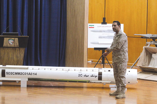 واستعرض المالكي أمام الدبلوماسيين أنواع الصواريخ وهي صاروخ دفاع جوي إيراني الصنع من نوع صياد (2) قام النظام الإيراني بتهريبه للحوثيين عن طريق مطار صنعاء في تحدٍ صارخ للقرارات الأممية حيث تمكن التحالف بدعم الشرعية في عملية نوعية بمصادرة هذه الصواريخ.. قبل وصولها لأيدي الحوثيين.. من خلال المراقبة على الأرض واستهداف عربة الإطلاق واستهدف الخبراء الذين يعملون عليها من النظام الإيراني كاشفاً أن مطار صنعاء يعتبر ثكنة عسكرية للمليشيات لاستقبال الأسلحة المهربة والصواريخ.. وهذا يعرّض مطارات الأمم المتحدة والطائرات المدنية للاستهداف.